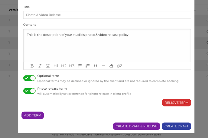 If your account already has access to this feature, you’ll see Photo release term listed as an optional toggle within your Terms and Conditions editor.